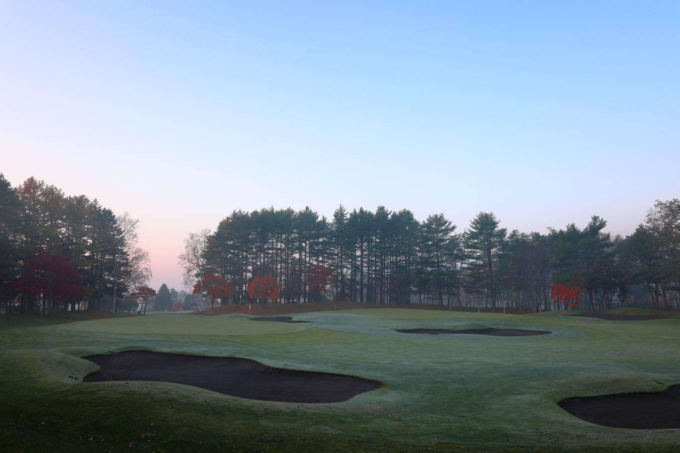 朝になり霧が深くなっていました。日が昇るにつれて晴れてくる見込みです。秋晴れの一日。最高のゴルフ日和になりそうです。