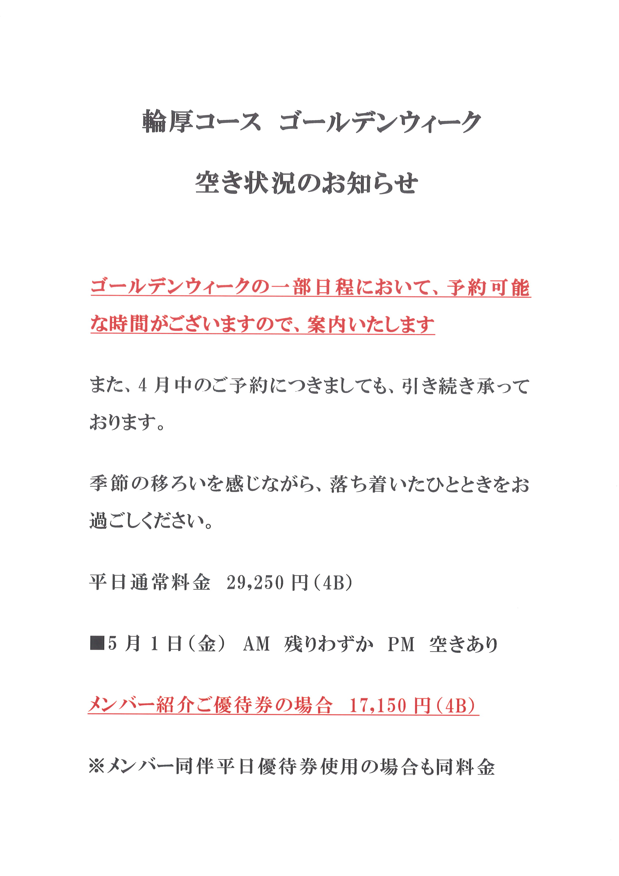 輪厚コース ゴールデンウィーク空き状況のお知らせ