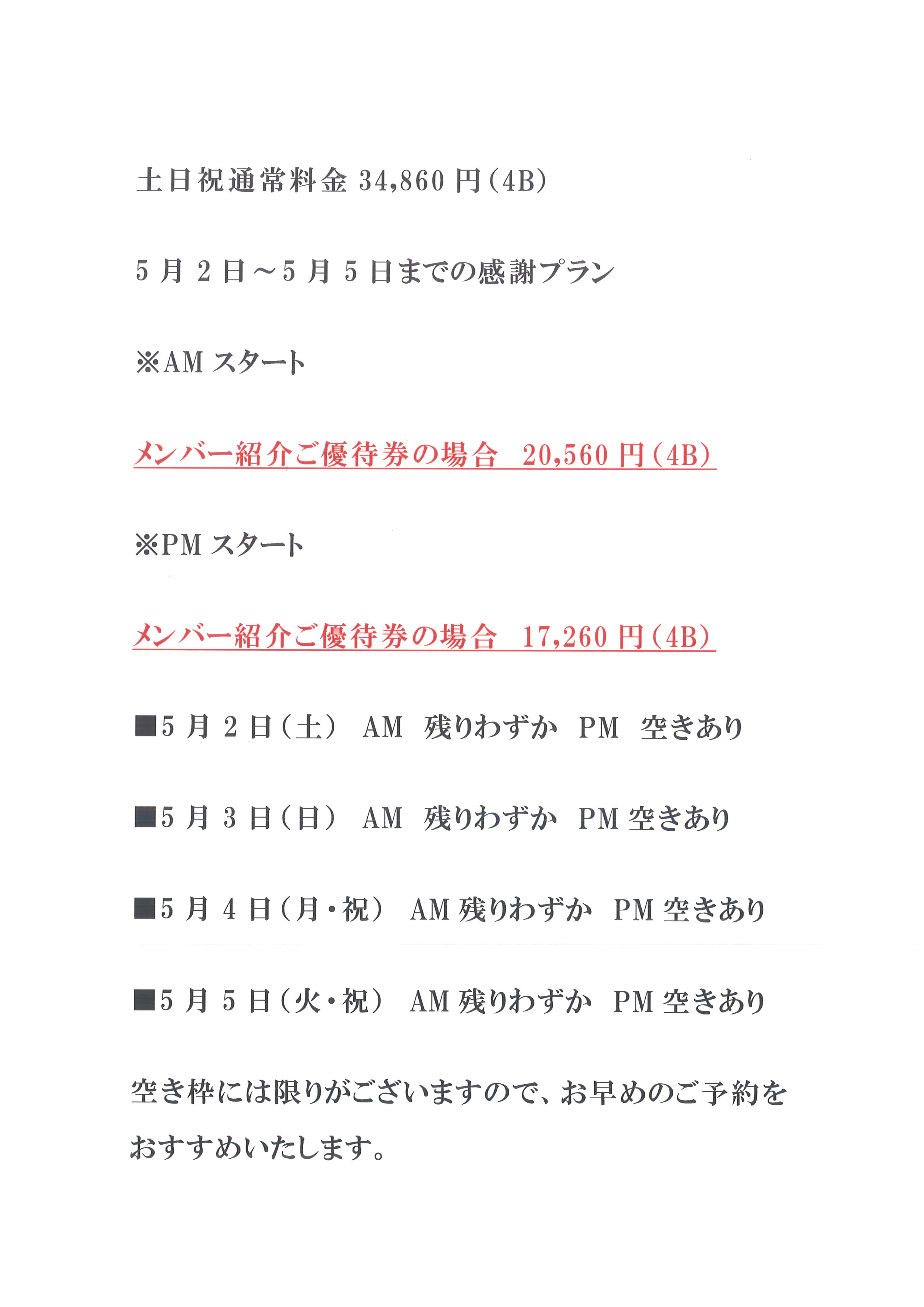4月9日(木)輪厚コース ゴールデンウィーク空き状況のお知らせ