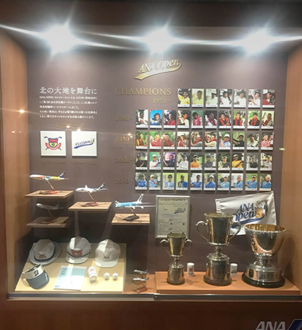 輪厚コースのロビーに併設されております「ANAオープンコーナー」には、これまでの歴代優勝者の写真や、優勝トロフィ等を展示しております。